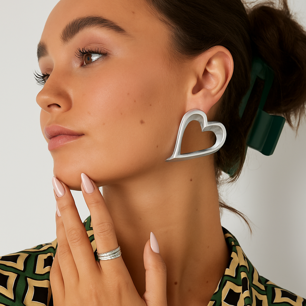 Natürlich! Hier ist ein passender Titel Verliebe dich in Statement-Stil! Unsere silbernen Herz-Ohrringe „Bold Love“ sind ein absoluter Blickfang und feiern deine Individualität mit kraftvoller Eleganz. Das moderne, offene Design in Herzform verleiht deinem Look eine künstlerische Note – mutig, feminin und einzigartig.