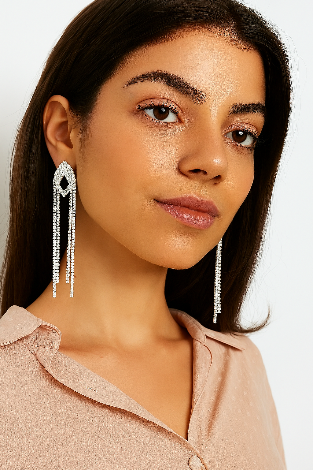 Funkelnd, elegant, ein Hauch Drama – die Ohrringe "Diamond Flow" sind gemacht für große Auftritte. Mit ihren feinen, beweglichen Strassketten und dem raffiniert geschwungenen Design setzen sie funkelnde Highlights bei jeder Bewegung. Leicht, aber wirkungsvoll – perfekt für Abendlooks, Hochzeiten oder deine nächste Party.