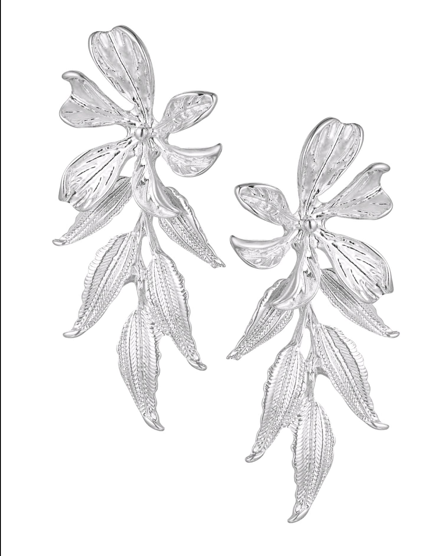 Extravagant, feminin, voller Ausdruck – die Ohrringe "Floral Muse" sind ein echtes Kunstwerk fürs Ohr. Das florale Design mit feinen Blatt- und Blütenelementen verleiht deinem Look eine verspielte Eleganz, während das glänzende Silber für moderne Frische sorgt. Ideal für besondere Anlässe oder mutige Alltags-Looks.